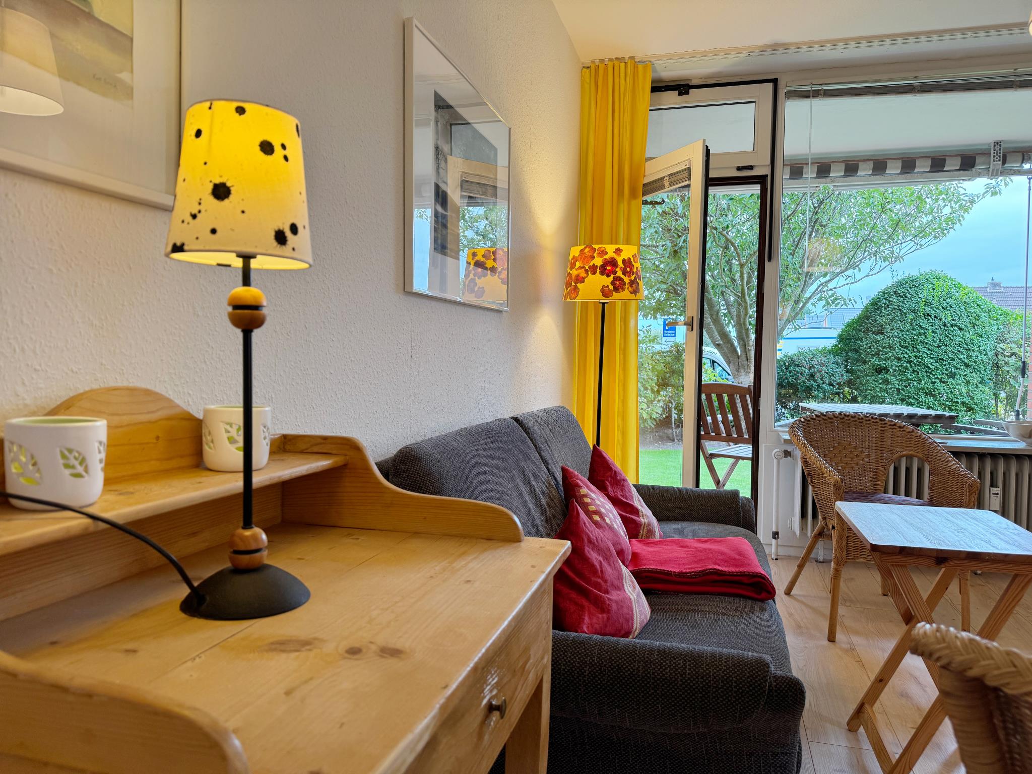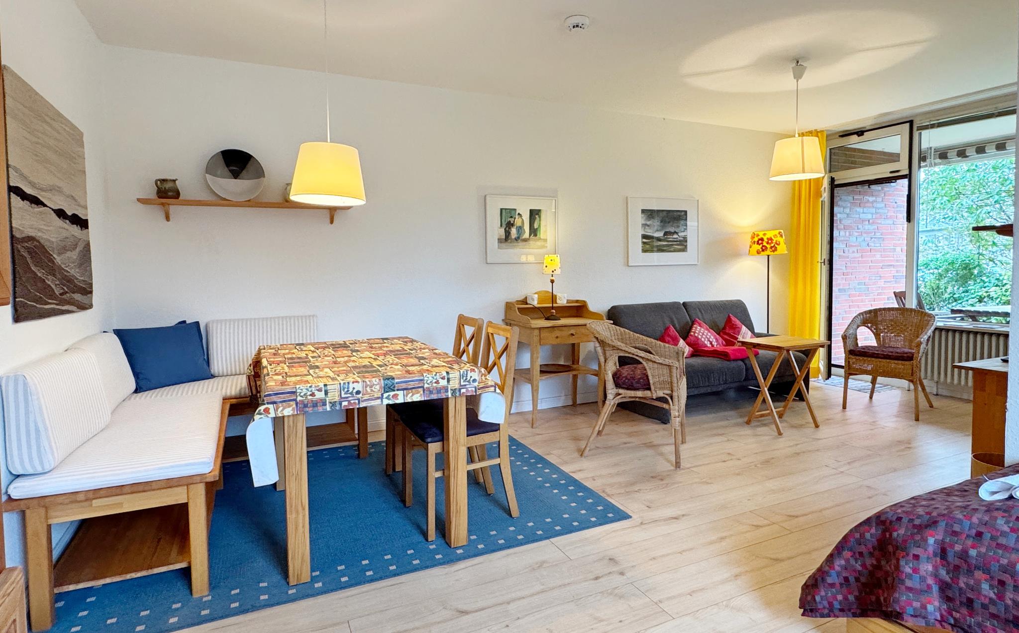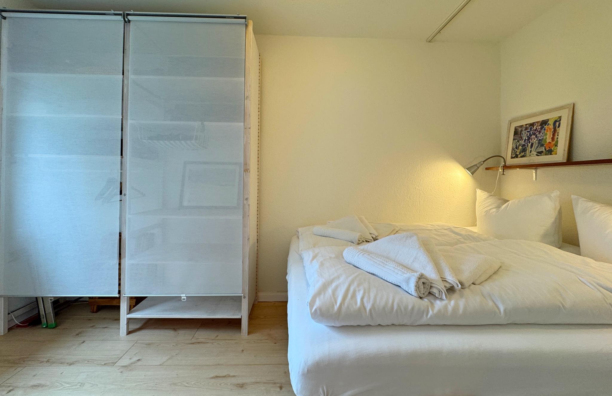 Das zur Loggia ausgerichtete Wohnzimmer ist möbliert mit einer geräumigen Essecke, einem kleinen Schreibplatz, einem Sofa und einem Zusatzbett (0,90 x 2,00). Durch das Westfenster scheint auch am Abend noch Sonne hinein. Das Schlafzimmer mit einem 160 x 200 breiten Doppelbett bietet einen Blick in den Garten.