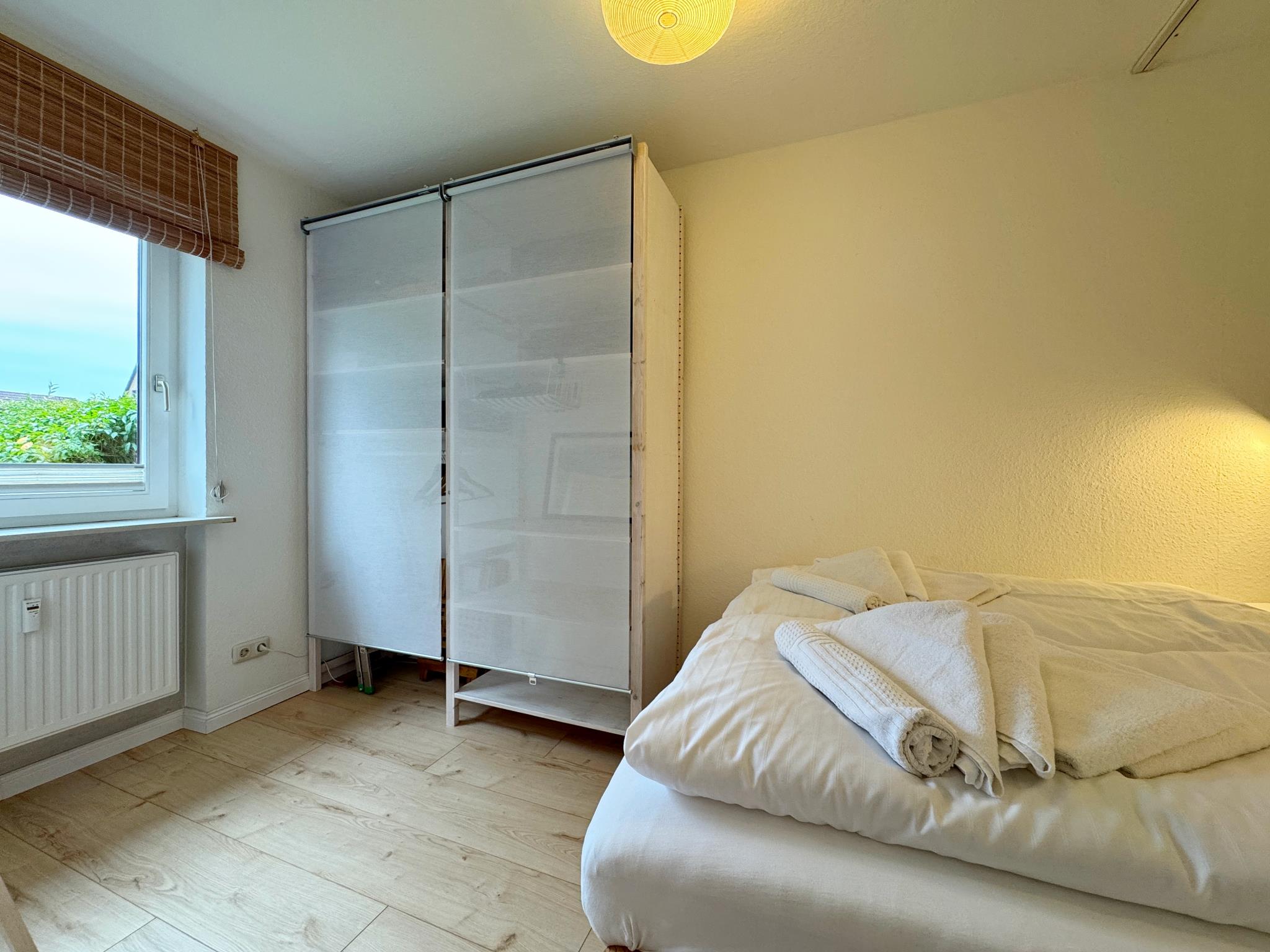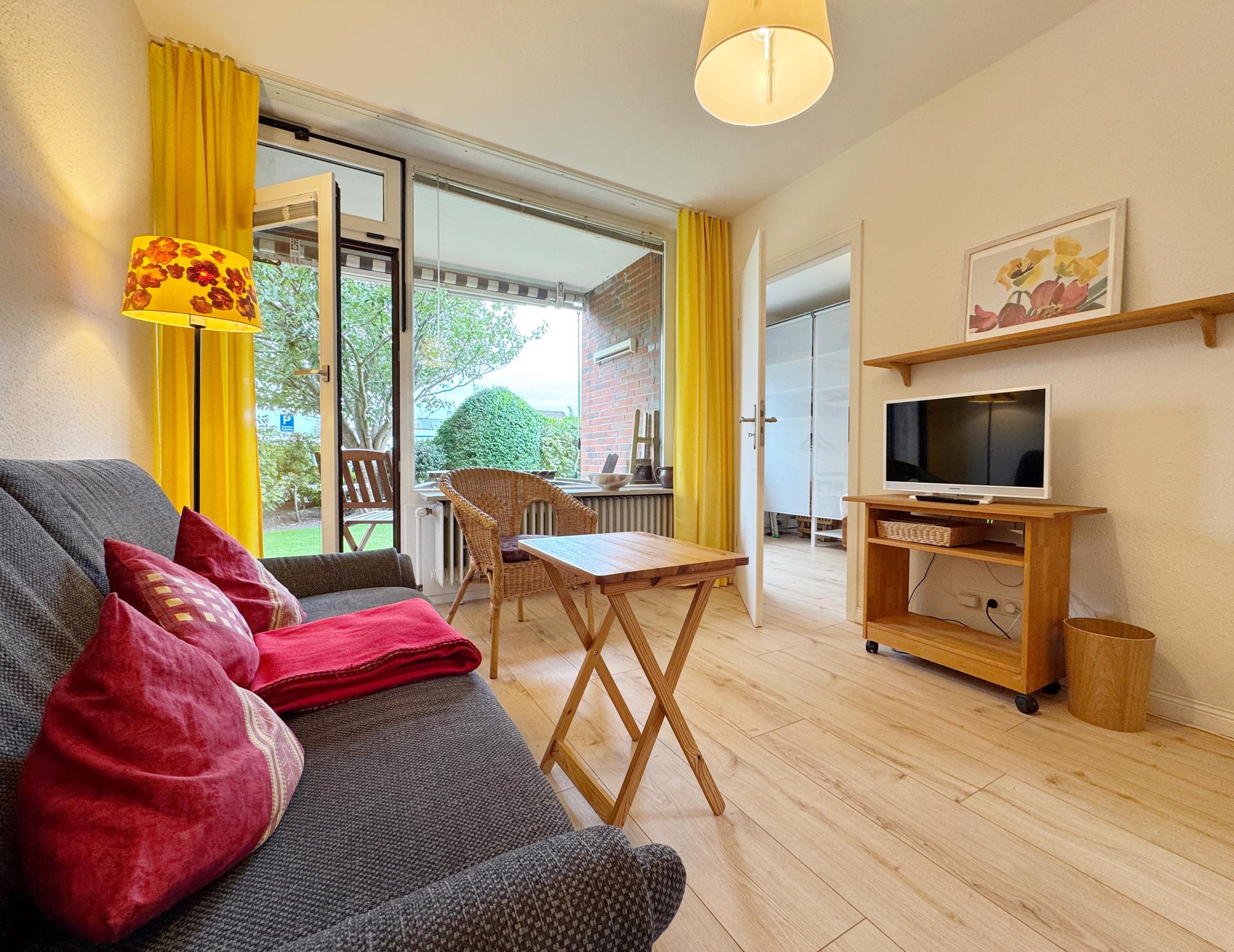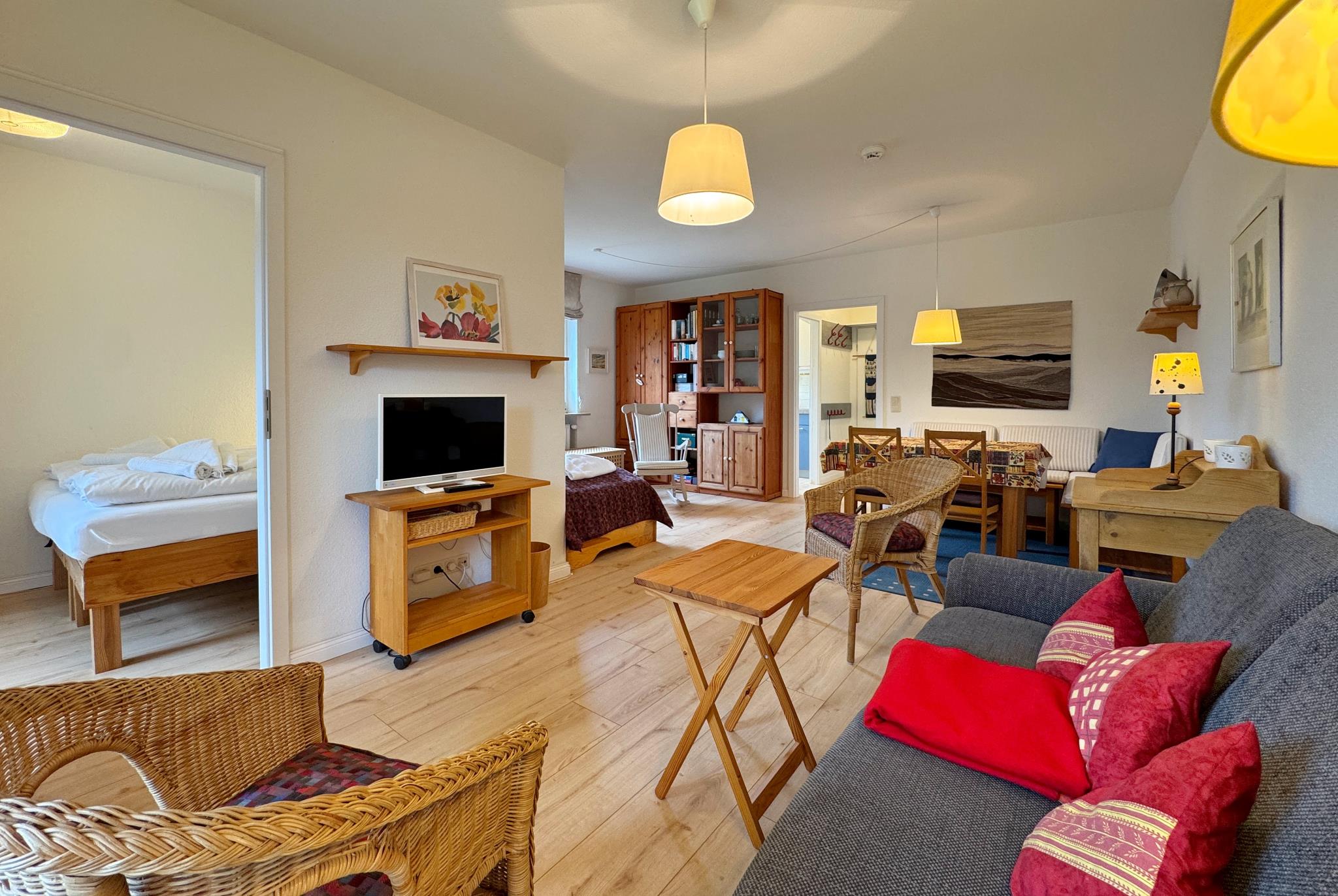 Das zur Loggia ausgerichtete Wohnzimmer ist möbliert mit einer geräumigen Essecke, einem kleinen Schreibplatz, einem Sofa und einem Zusatzbett (0,90 x 2,00). Durch das Westfenster scheint auch am Abend noch Sonne hinein. Das Schlafzimmer mit einem 160 x 200 breiten Doppelbett bietet einen Blick in den Garten.