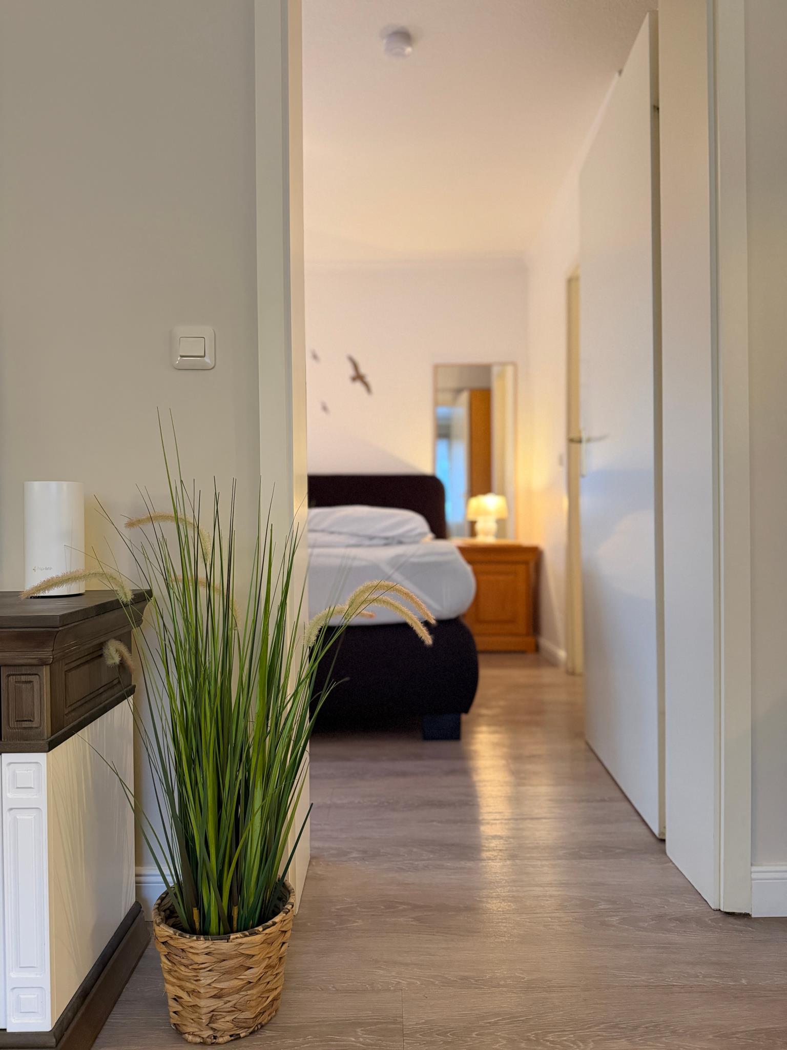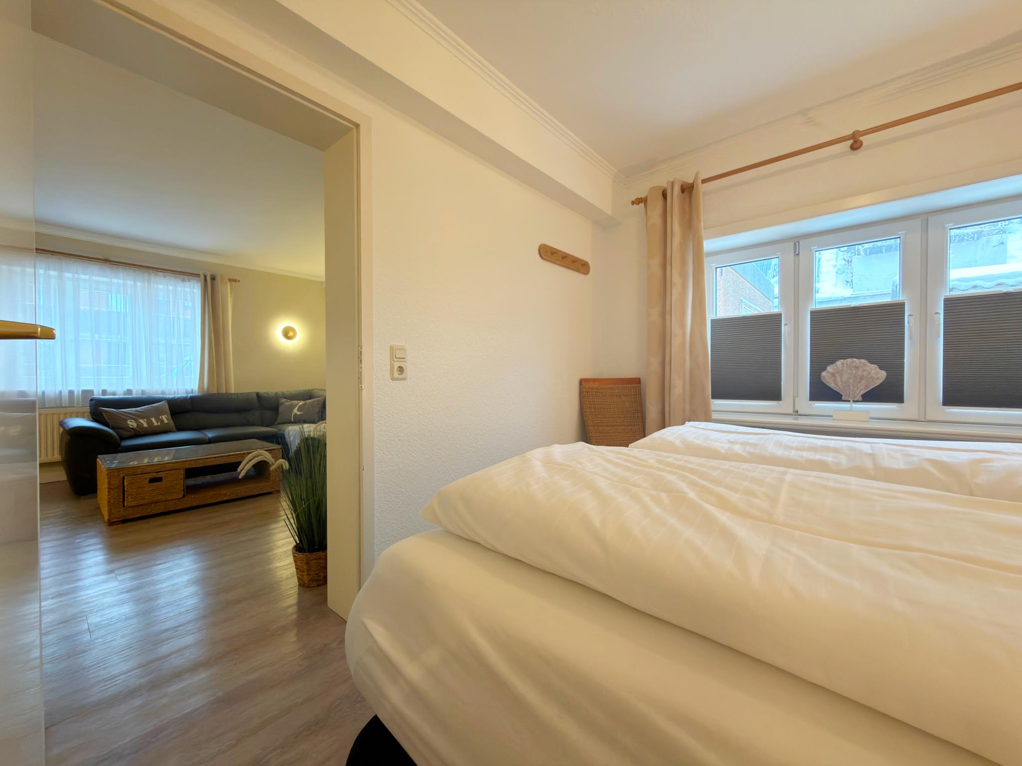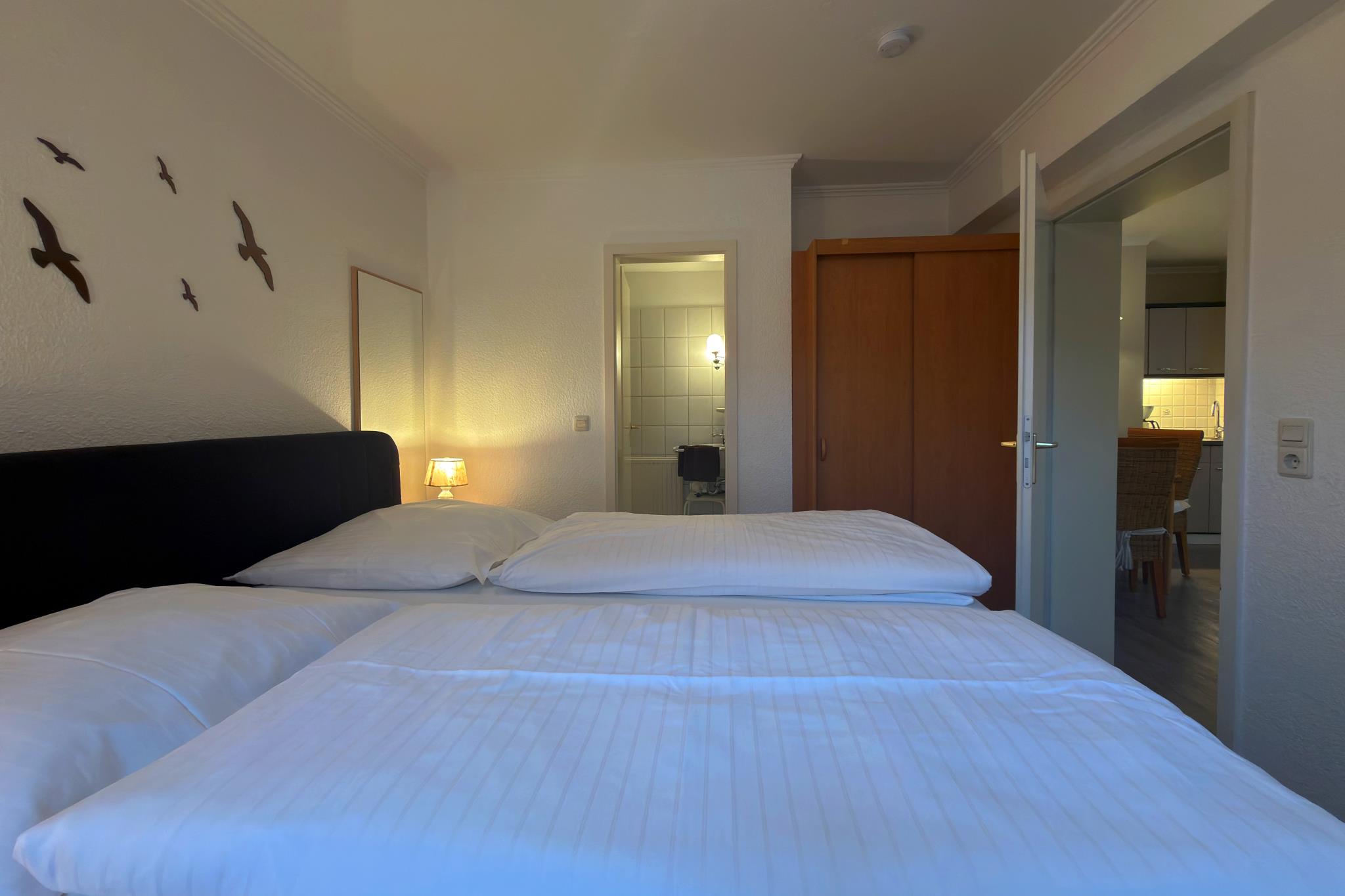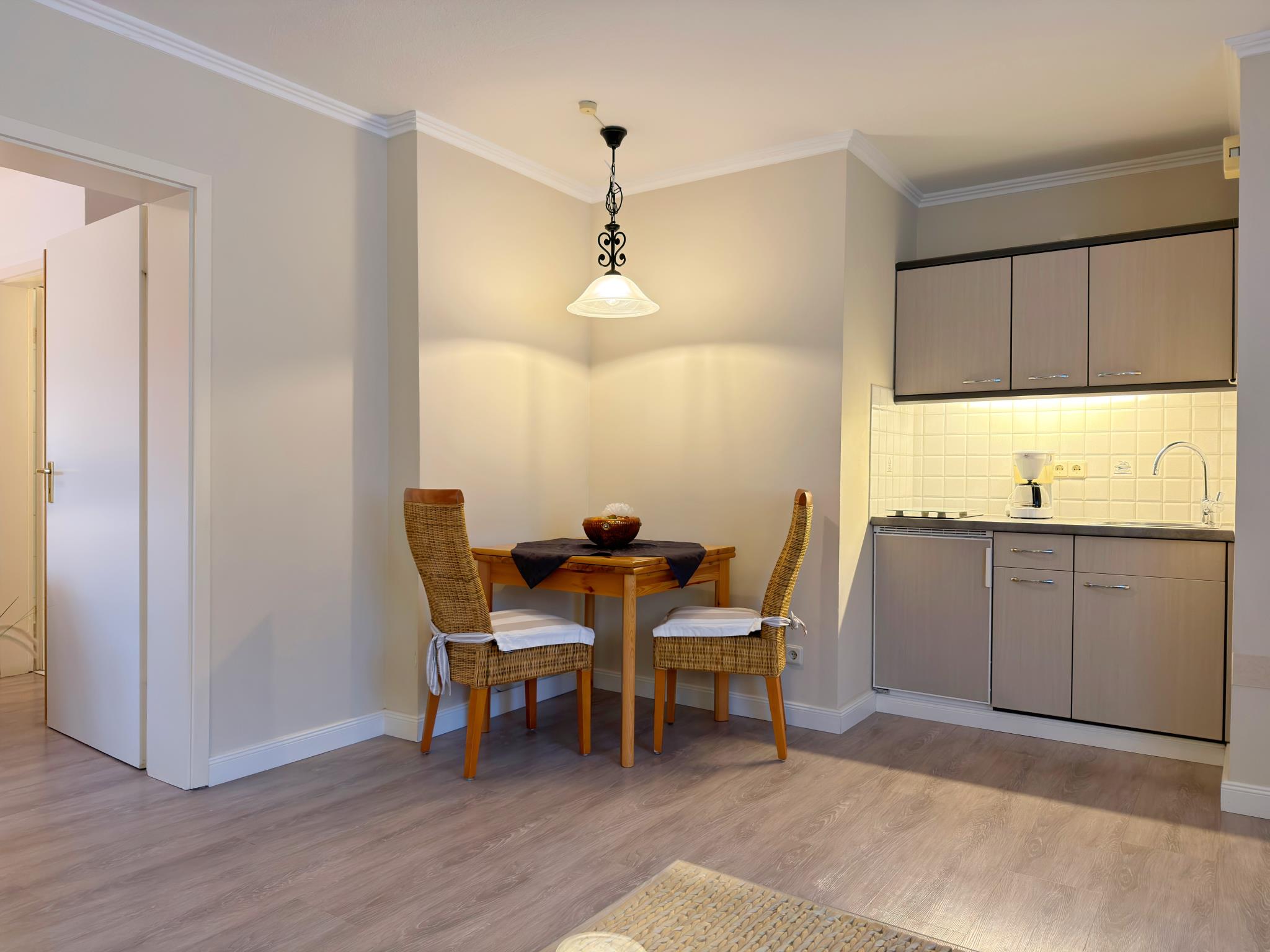 Das Appartement verfügt über ein separates Schlafzimmer mit komfortablem Doppelbett sowie ein Schlafsofa, das zusätzliche Schlafmöglichkeiten bietet. Der offene Wohn- und Essbereich ist hell, gemütlich und lädt zum Verweilen ein – ob beim Frühstück oder einem entspannten Abend.