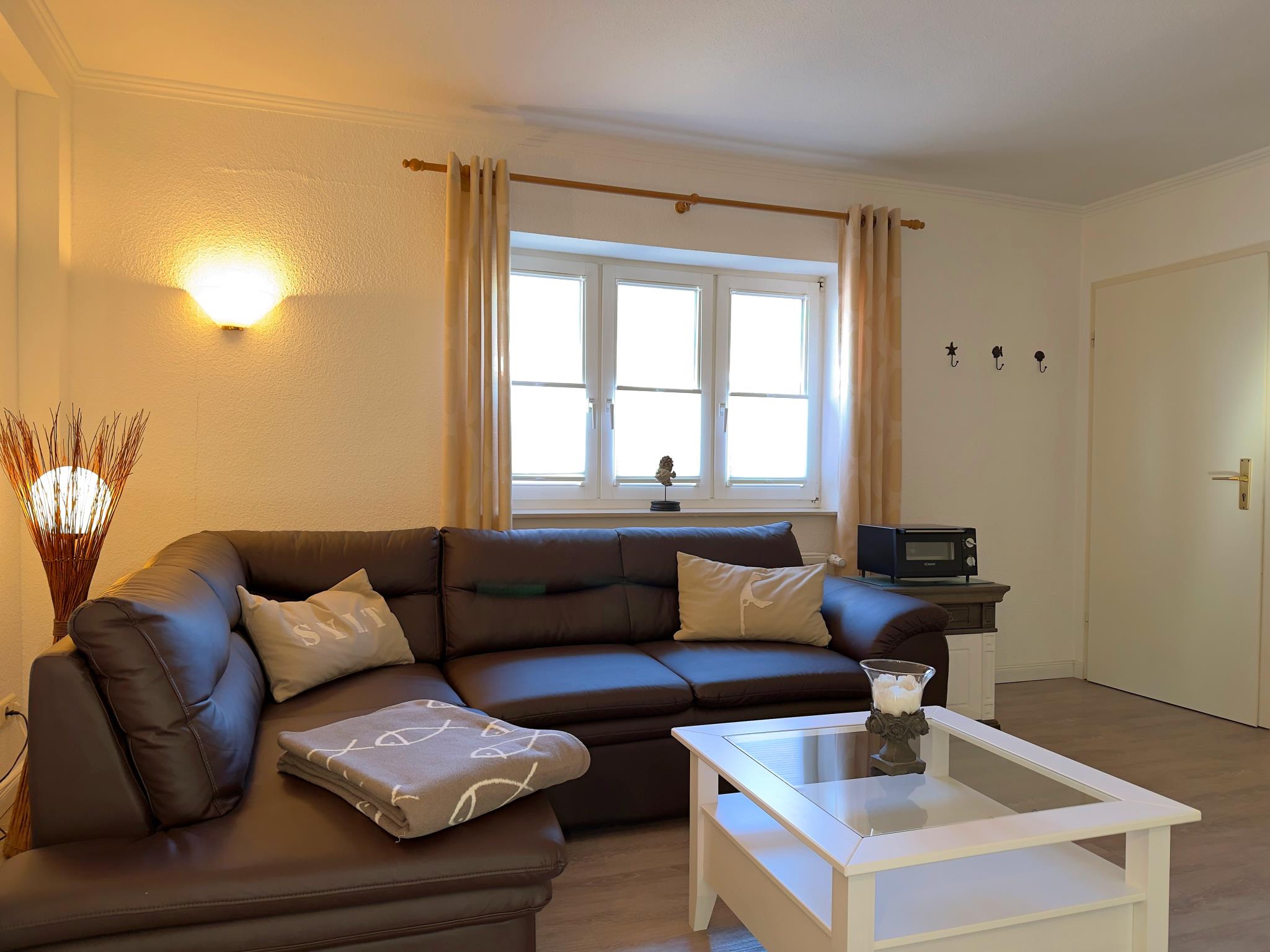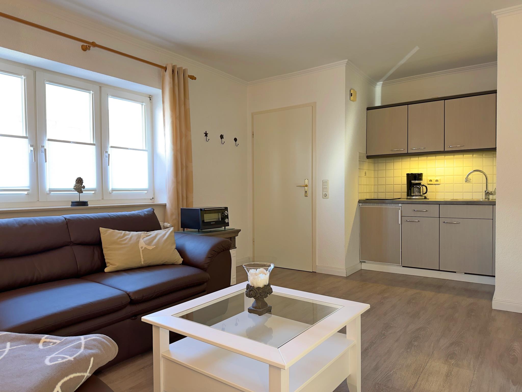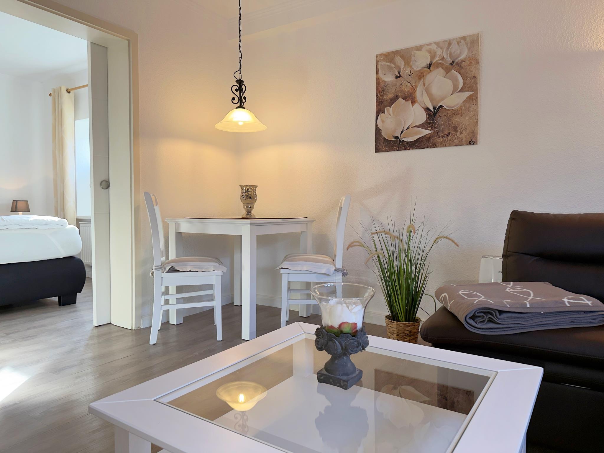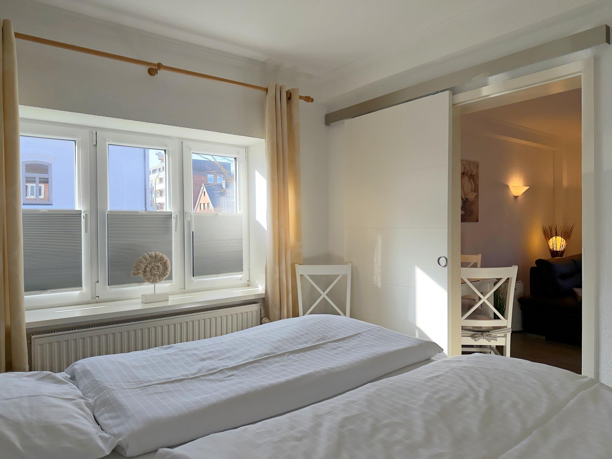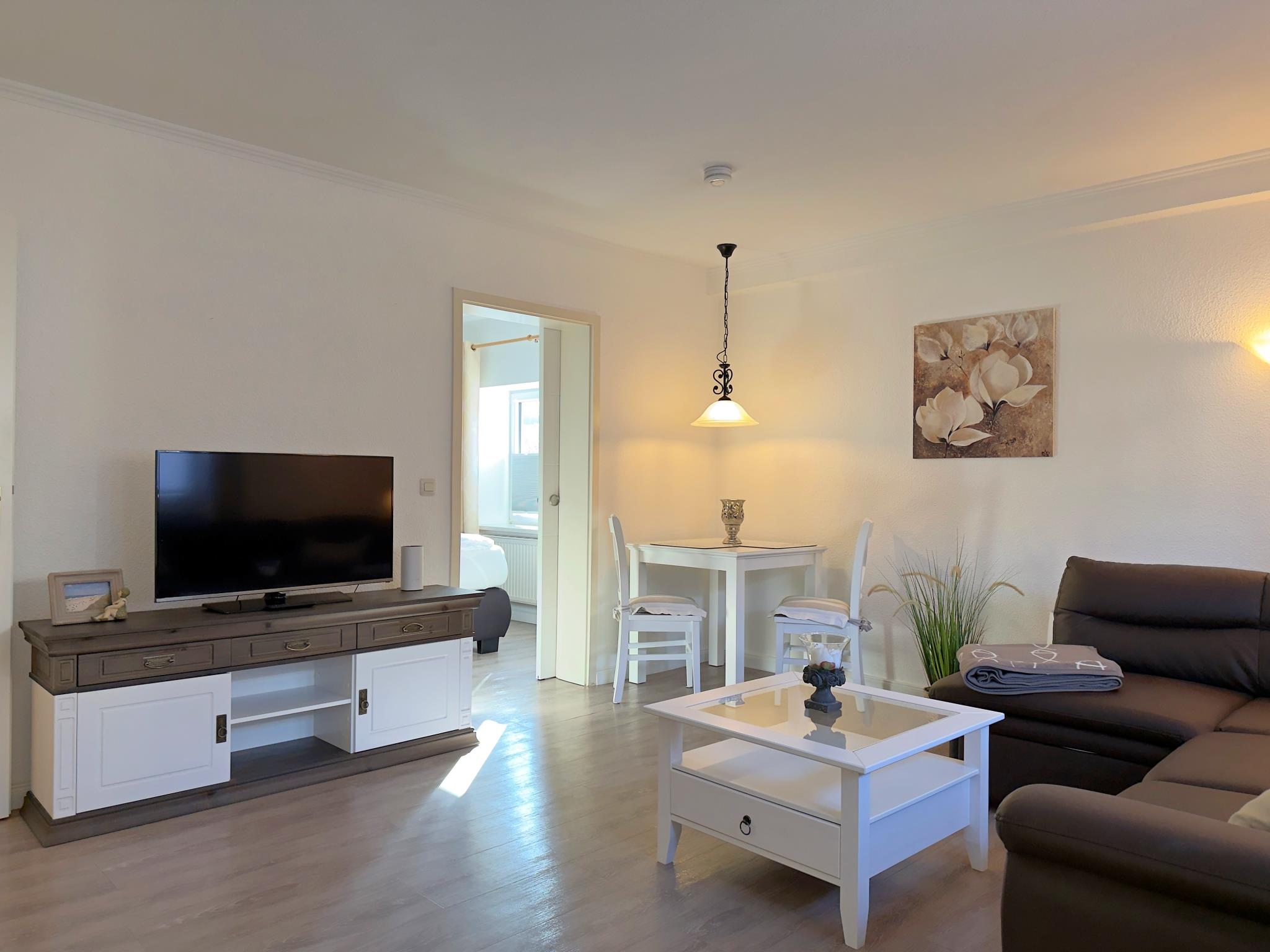 Das Appartement bietet ein Schlafzimmer mit Doppelbett sowie ein praktisches Schlafsofa im Wohnbereich. Der offen gestaltete Wohn- und Essbereich schafft eine angenehme Atmosphäre und eignet sich perfekt für gemeinsame Mahlzeiten oder entspannte Stunden nach einem Tag an der frischen Nordseeluft.