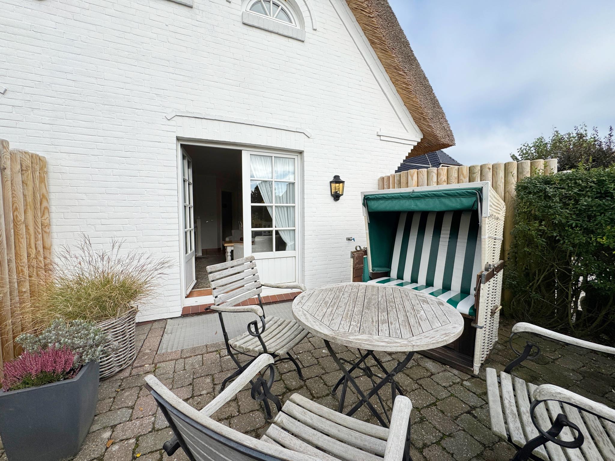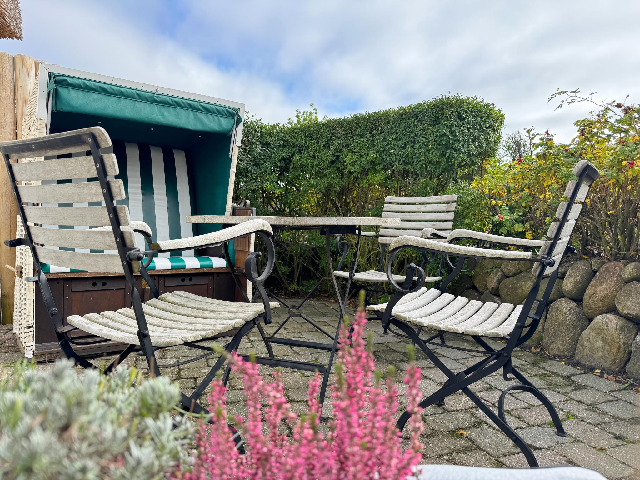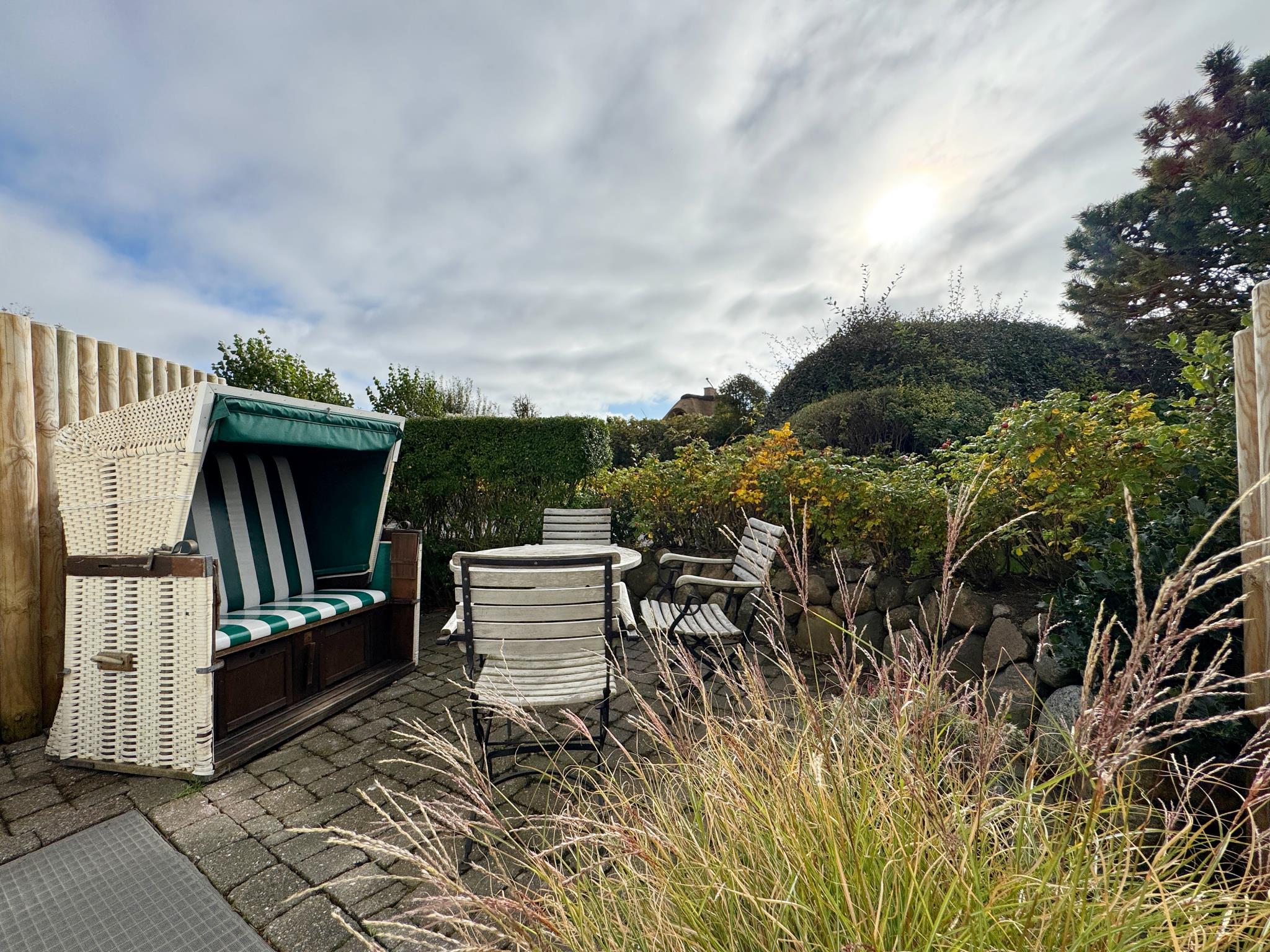 Ein besonderer Vorzug ist die sonnige Terrasse, die direkt vom Wohn- und Essbereich aus erreichbar ist. Hier können Sie im Strandkorb die frische Nordseeluft genießen und den Tag in gemütlicher Atmosphäre ausklingen lassen.